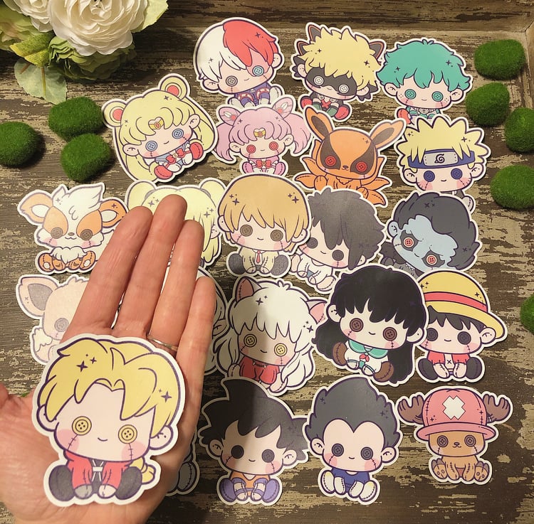 Otaku Plush Pals in sticker form • Inuyasha • Kagome • Sesshomaru • Naruto • Kurama • Edward • Alphonse • Goku • Vegeta • Sailor Moon • Chibi Moon • Deku • Bakugo • Todoroki • Arcanine • Eevee • Misa • Light • Ryuk • L • Luffy • Chopper Smiley Face Sticker (transparent) • Die cut stickers • Size: 3" x 3" • Waterproof Magical House Trait Stickers • Die cut stickers • Size: 2.6" x 3" • Waterproof • Gryffindor - Courage & Determination • Slytherin - Cunning & Ambitious • Ravenclaw - Intelligence & Creativity • Hufflepuff - Loyalty & Honesty