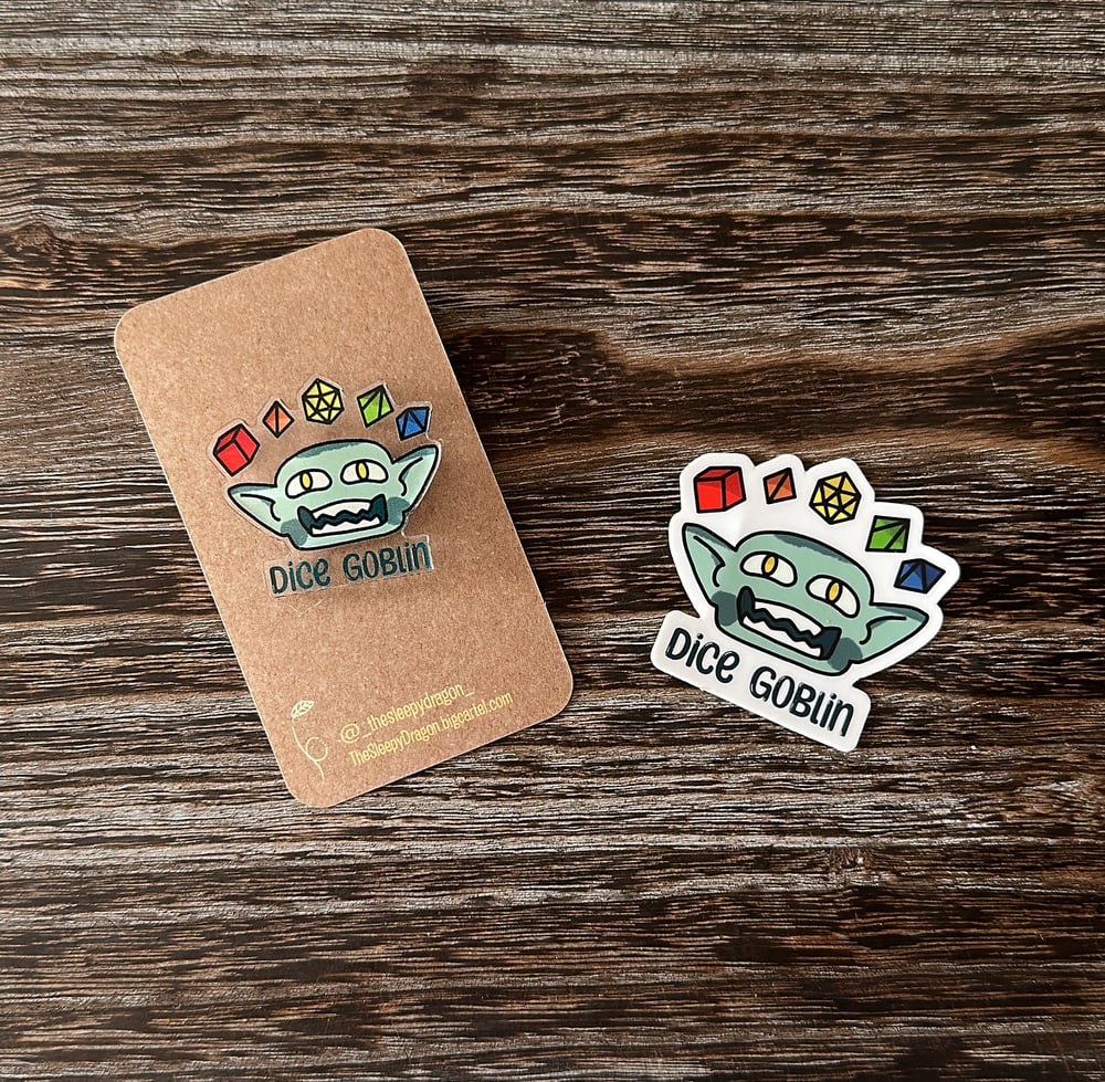 Anyone else love to collect dice? Anyone call you a dice goblin? This snarky little one is for you! • Acrylic Pin with Screen Print • 1.5" Die Cut Sticker • Waterproof • 2"
